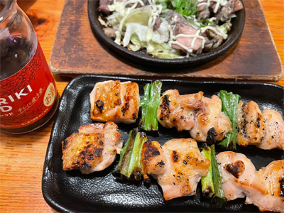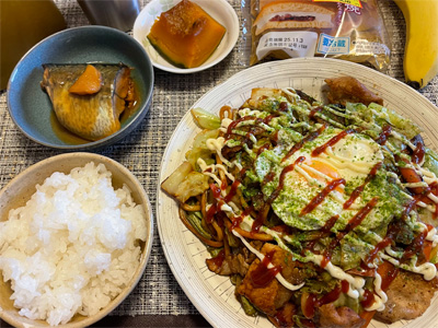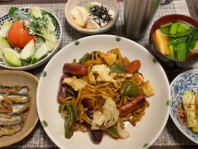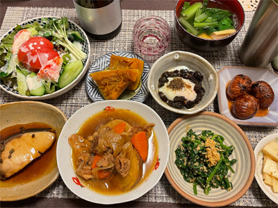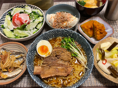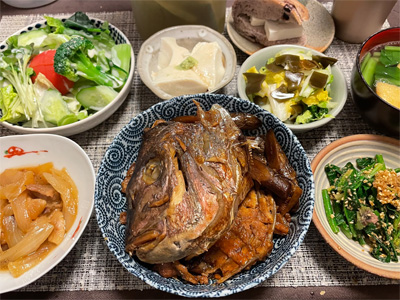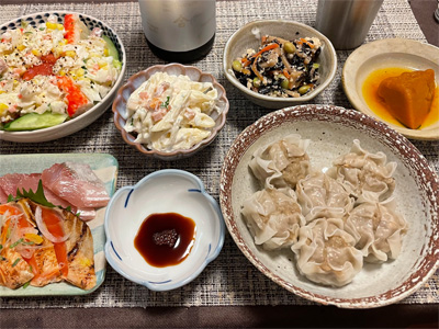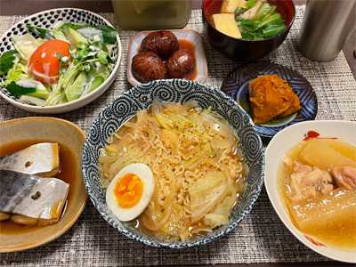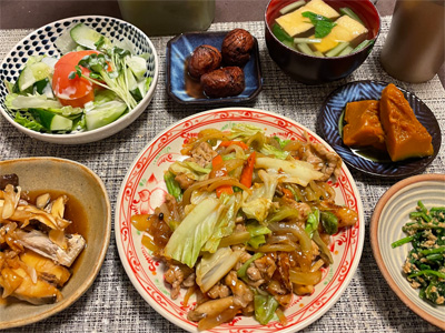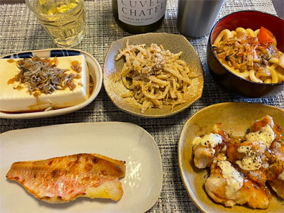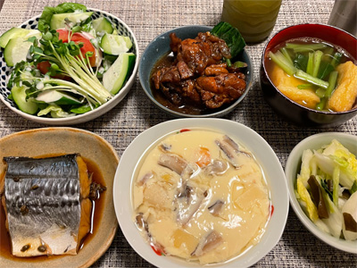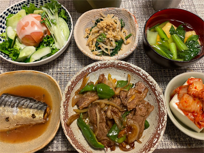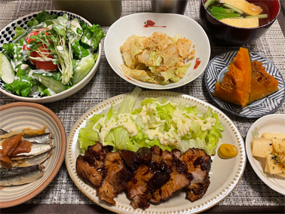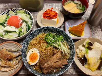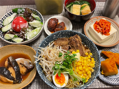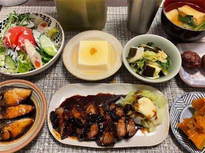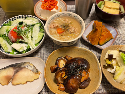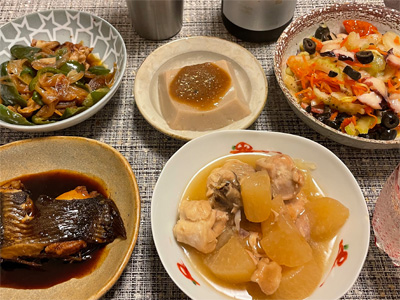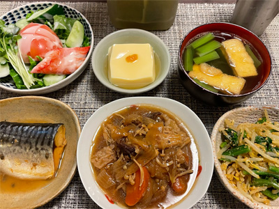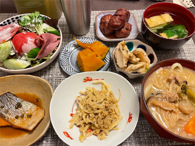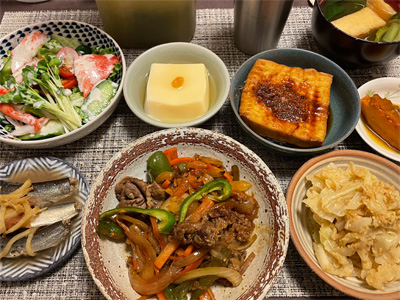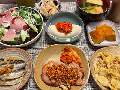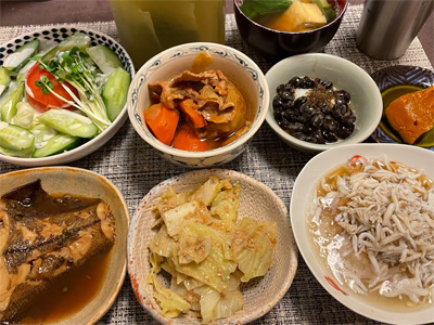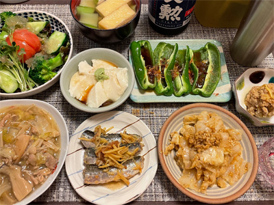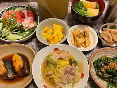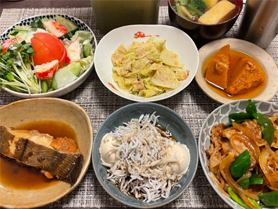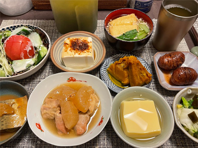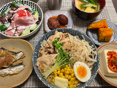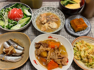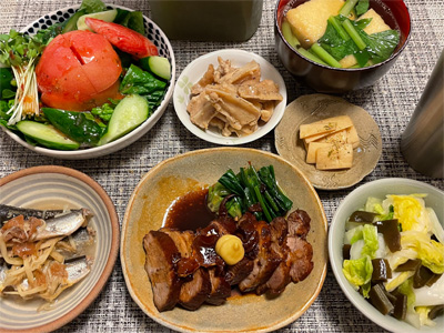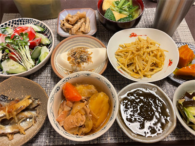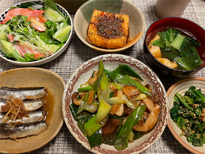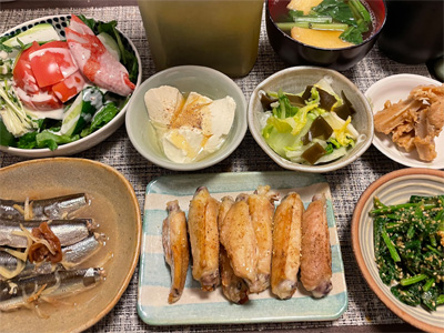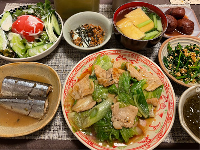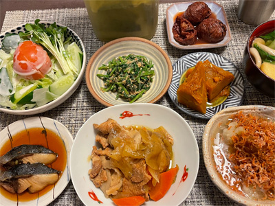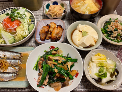 イワシの梅煮、野菜サラダ、焼き鳥、タラの子の煮付け、キャベツと玉ねぎとおかげの味噌汁、ほうれん草と蒸し押し麦のおかか和え、山芋豆腐、白菜の昆布漬け、豚肉とニラの炒めもの。