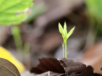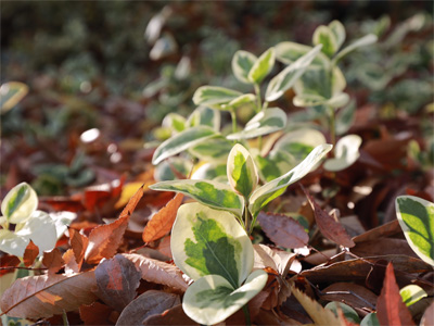 陽光を浴びるツルニチニチソウ(班入り葉)。