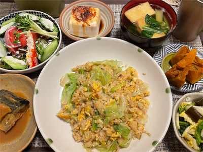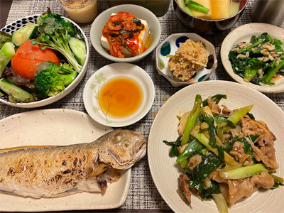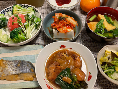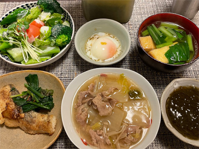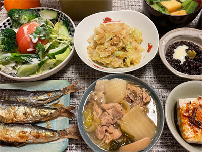 イワシの塩焼き、野菜サラダ、キャベツのごま和え、小松菜とお揚げのお汁、黒豆納豆の巣ごもり玉子、冷奴、豚肉と白菜とキノコの煮込み。デザートに、キウイフルーツとみかん。