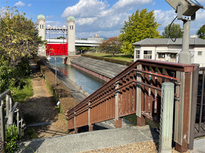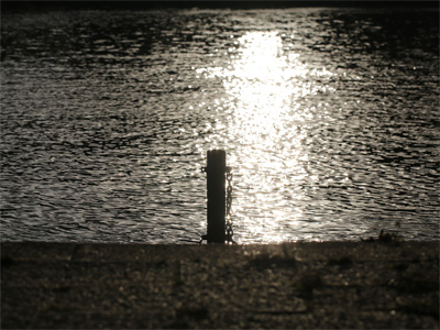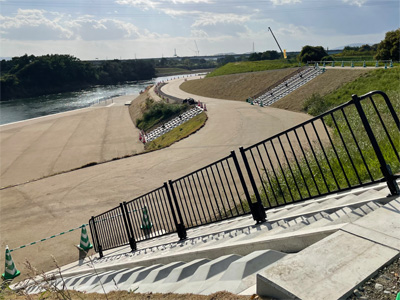 河川敷の車止めゲートです。夕陽に照らされるメタリックな光沢がたまりません。