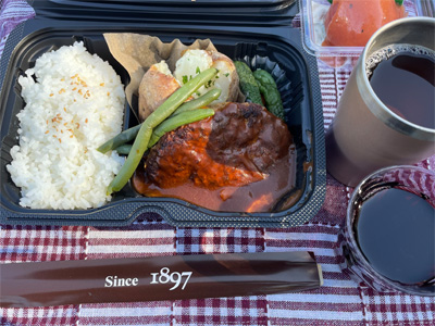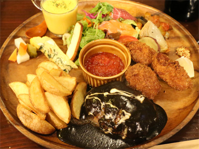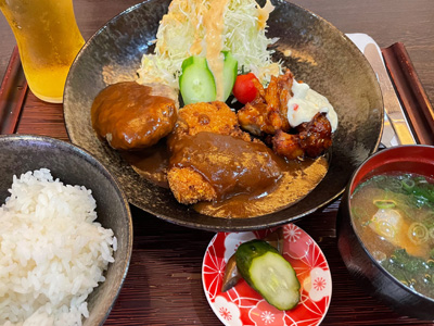 メインはこれまた盛りだくさんの、手ごねハンバーグ+ローストチキン+牡蠣フライのセット。で、赤ワインをデキャンタ1本いただきました。