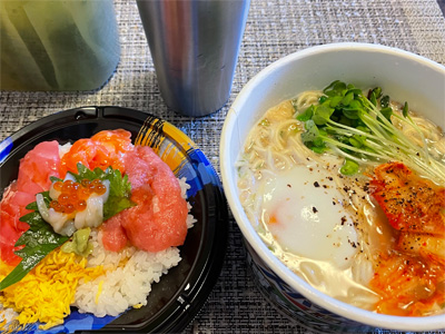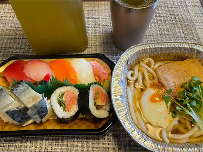 翌日はスーパーの寿司(500円)と、簡単うどん(138円)で朝昼兼表。