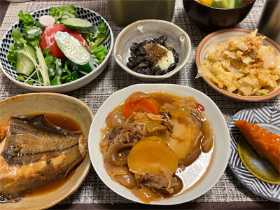 赤かれいの煮付け、野菜サラダ、キムチ冷奴、小松菜のかきたま汁、キャベツのたらこマヨネーズ和え、キャロットラペ、牛肉のすき焼き風。デザートにみかんと、アロエヨーグルト。