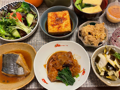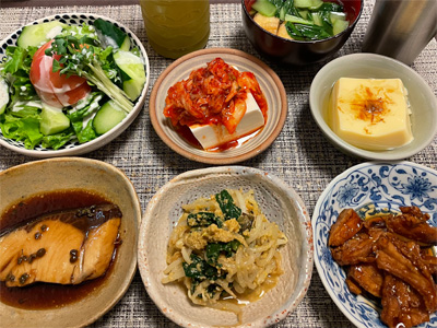銀鮭の西京焼き、野菜サラダ、キムチ冷奴、小松菜のかきたま汁、鶏手羽元と玉ねぎの煮込み、じゃがバター明太子&ほうれん草。デザートにタカナシのヨーグルト。
