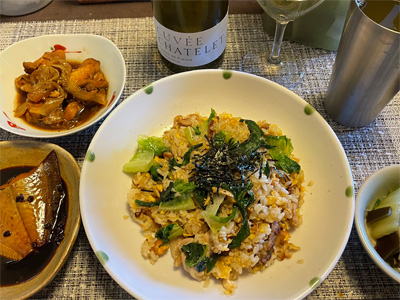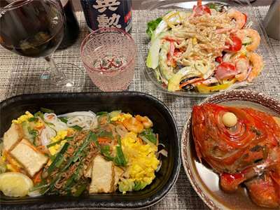 夕食は自宅にて、成城石井で3割引になっていたパッタイと、スーパーのサラダと、半額で買った金目鯛を煮煮付けにした一品とで、赤ワインと日本酒。