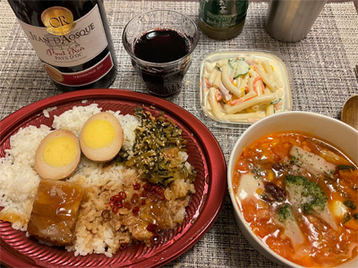 東寺から帰宅して、成城石井の値引き総菜(ルーローハンとミネストローネ)で赤ワイン1本。