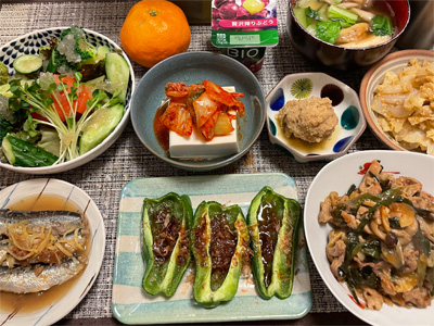 イワシの梅煮、野菜サラダ、キムチ冷奴、タラの子の煮付け、小松菜としめじとお揚げのお汁、キャベツのごま和え、豚肉とにらの炒め煮、焼きピーマンのおかかポン酢。デザートにみかんと、ぶどうヨーグルト。