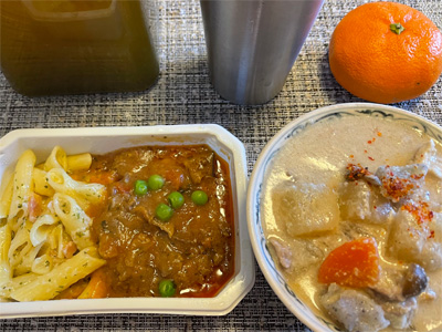 元日の第一食は、取り寄せで購入した機内食セットと、かす汁です。