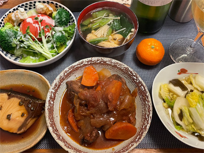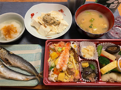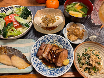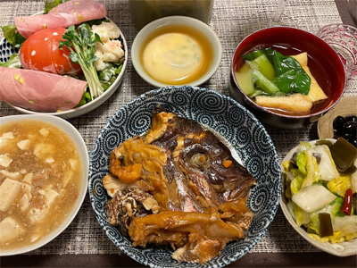 豆腐と豚肉のあんかけ、野菜&ハム(頂きもの)のサラダ、玉子豆腐、小松菜とお揚げのお汁、黒豆煮、白菜の昆布漬け、鯛あら煮。で、日本酒と白ワインを少々。