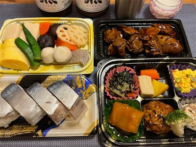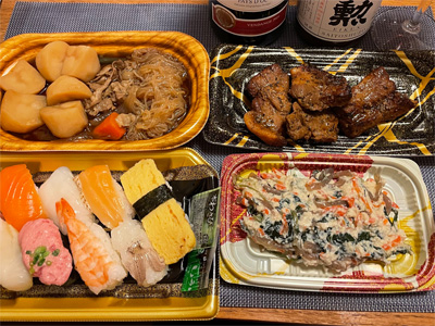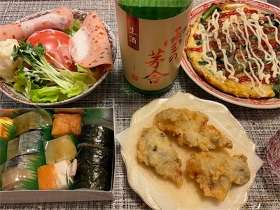 百貨店で買って帰った総菜(ひさご寿司)と、サラダ&ハム(頂きもの)、スペインオムレツ、牡蠣の天ぷらで自宅にて日本酒。