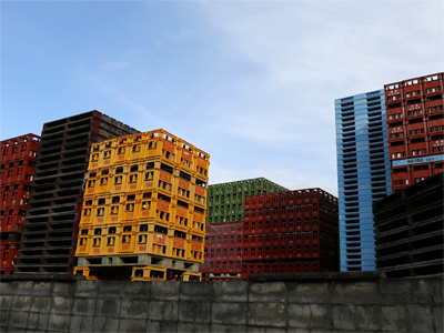 地味にカラフル。酒の空瓶コンテナ置き場のようです。