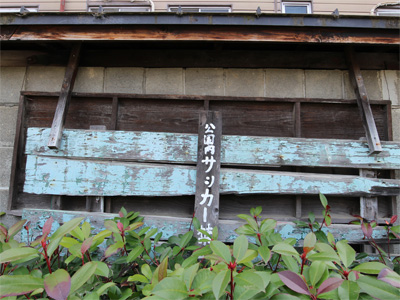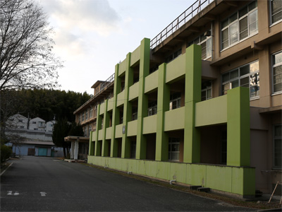 母校の小学校。手前の緑色のブロック構造は耐震工事のようです。