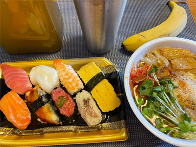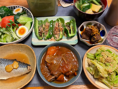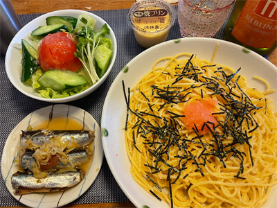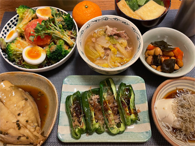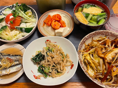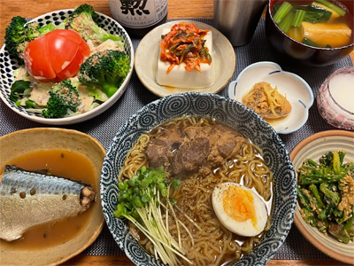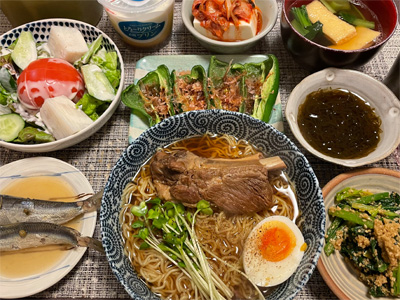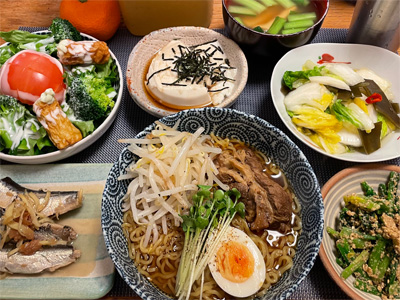 いわしの煮付け、野菜サラダ、焼きピーマンのおかかポン酢、キムチ冷奴、小松菜とお揚げのお汁、もずく酢、ほうれん草の胡麻和え、自家製ラーメン。デザートにクリームプリン。