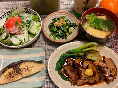 鰆の西京焼き、野菜サラダ、ほうれん草の胡麻和え、小松菜とお揚げのお汁、焼き豚と付け合わせの青梗菜。デザートにみかんと、苺ミルクエクレア。