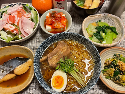 鰆の山椒煮、野菜&ハムのサラダ、キムチ冷奴、小松菜とお揚げのお汁、青梗菜のからし和え、ほうれん草の胡麻和え、自家製ラーメン。デザートにみかんと、チチヤスヨーグルト。