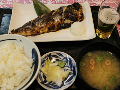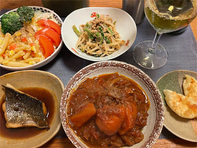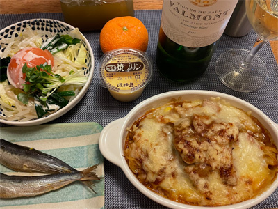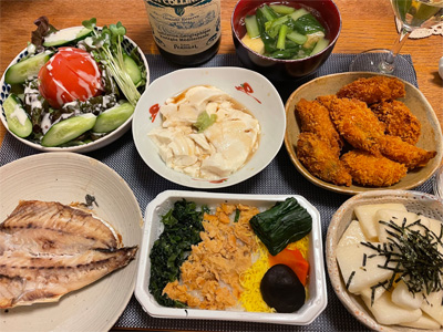 自宅に戻って夕食。あじの塩焼き、野菜サラダ、湯葉豆腐、小松菜とお揚げの味噌汁、カキフライ、長芋の酢醤油和え、機内食セット。で、白ワイン。