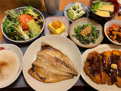 大根おろしポン酢、野菜サラダ、出汁巻き玉子、アボカドのわさび醤油マヨ、ほうれん草の胡麻和え、小松菜とお揚げの味噌汁、大豆の煮物、とんかつ、あじの開き。デザートにみかんと、いちごエクレア。