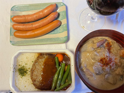 食事会から帰宅して、自宅にて機内食セットと、ソーセージ(いただきモノ)、かす汁で赤ワイン。