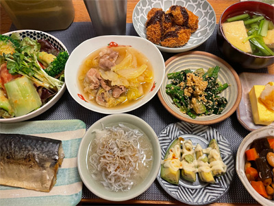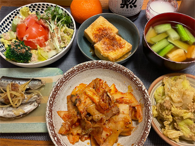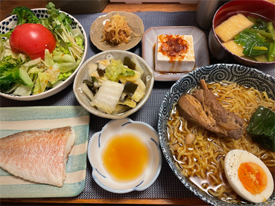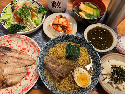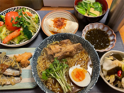 アジの塩焼き、野菜サラダ、キムチ冷奴、小松菜とお揚げのお汁、もずく酢、長いもの酢醤油和え、自家製ラーメン。デザートにミカンと、パルテノヨーグルト。