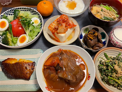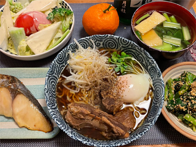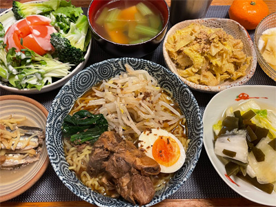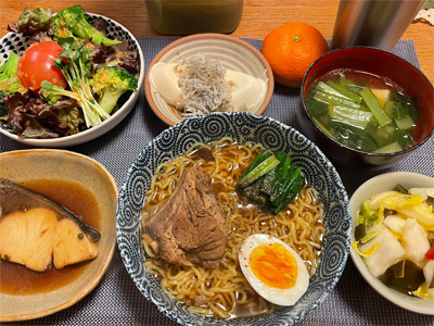 ブリの煮付け、野菜サラダ、ちりめんじゃこポン酢の冷奴、小松菜とお揚げの味噌汁、白菜の昆布漬け、自家製ラーメン。デザートにみかんと、フォンダンショコラ。