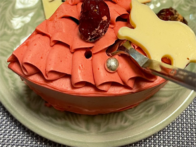 カワハギの煮付け(カワハギは肉離れがよくて食べやすく大好き!)、野菜&ゆでたまごのサラダ、豚肉と白菜の煮物、小松菜とお揚げのお汁、大豆の煮物、ちりめんじゃこポン酢の冷奴、焼きピーマンのおかか醤油。デザートにみかんと、ラズベリーとチョコレートのバターケーキ(京都は東山区の「日々菓子」さん製、最高です!!)。