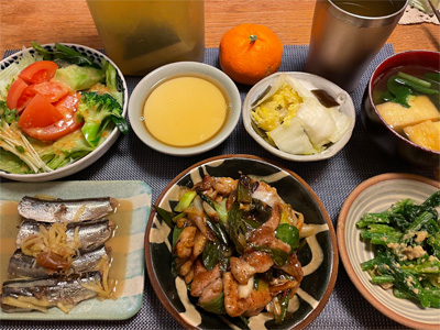 いわしの梅煮、野菜サラダ、厚揚げのおかかポン酢、小松菜とお揚げのお汁、キャベツのごま和え、豚キムチ。デザートにみかんと、クリームプリン。
