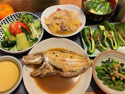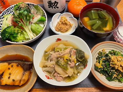 豚肉と白菜とえのきだけの煮物、野菜サラダ、たらこの煮付け、小松菜とお揚げのお汁、キャベツのごま和え、赤カレイの煮付け。デザートにみかんと、パルテノヨーグルト。