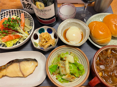 週末ですが家呑みにしました。鰆の西京焼き、野菜サラダ、たらこの煮付け、温泉玉子、ロールパン、ビーフシチュー、キャベツのハニーマスタードで、赤ワインとにごり酒。