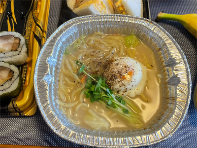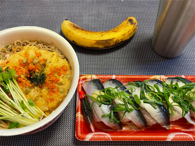 翌日はカップそばと、いわしの寿司、バナナで朝昼兼用。