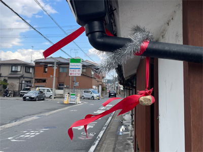 画像に写っている建物は、雨樋に赤いリボンと銀色のモールで飾りが施されています。