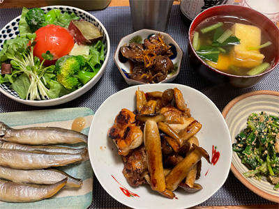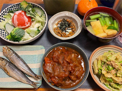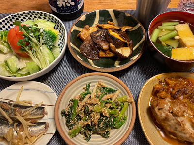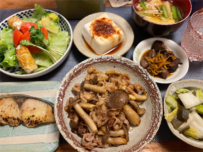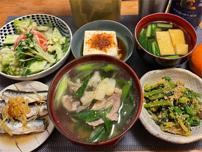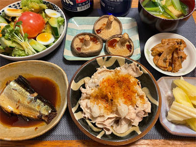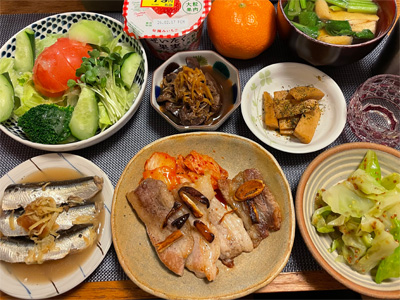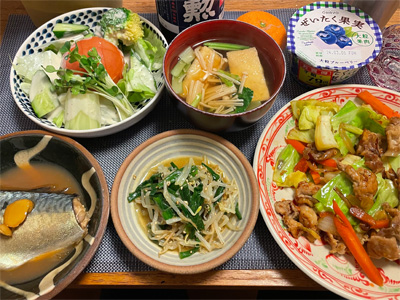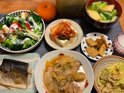 塩サバの山椒煮、野菜サラダ、冷奴&わさび漬け、小松菜と大根とお揚げの味噌汁、ほうれん草の胡麻和え、豚肉とネギとしめじの煮物。デザートにポンカンと、生どら焼き。
