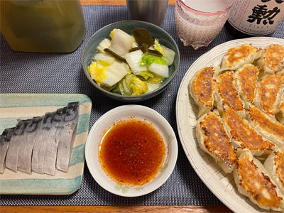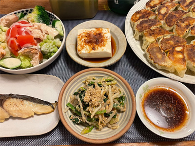 週末は例によって宅呑み続き。鰆の西京焼き、野菜サラダ、湯豆腐、ギョウザ、モヤシとほうれん草の胡麻和え。で、日本酒。
