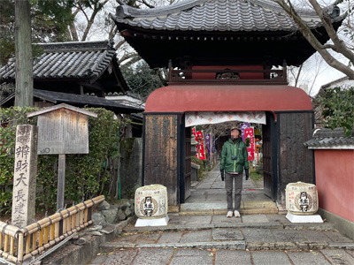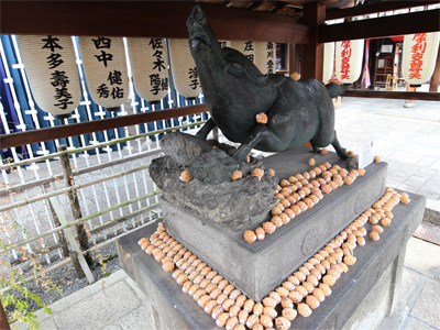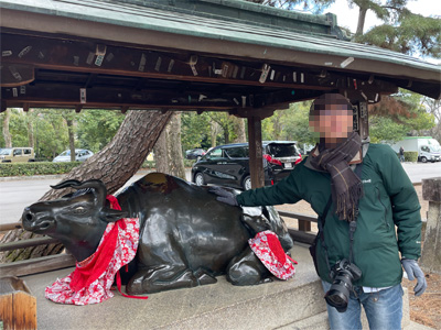 せっかくなので近くにある北野天満宮にも足を運びました。祀られているのが学問の神様で、牛をなでると頭が良くなるそうです。