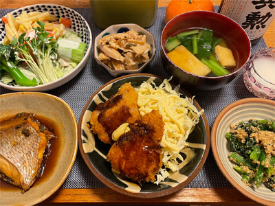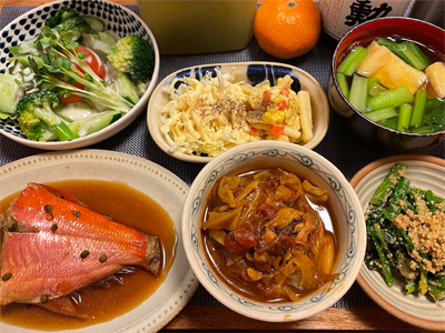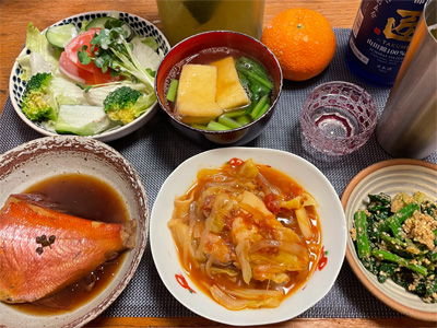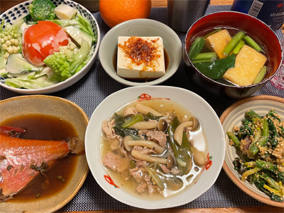 金目鯛の煮付け、野菜サラダ、湯豆腐、小松菜とお揚げのお汁、ほうれん草の胡麻和え、豚肉とネギとしめじのいしり煮。デザートにみかんと、チョコクレープ。
