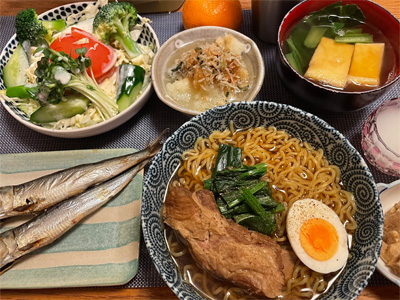 いわしの梅煮、野菜サラダ、キャベツの胡麻和え、小松菜とお揚げのお汁、自家製ラーメン。デザートにヨーグルト。