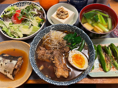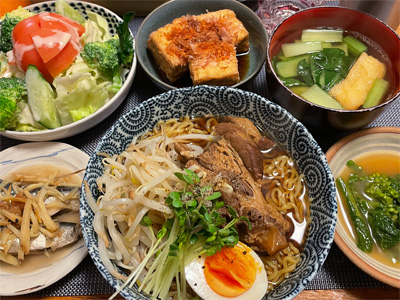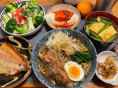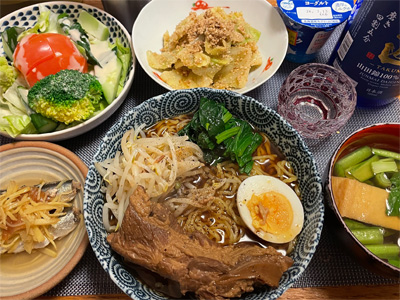 にしんの山椒煮、野菜サラダ、冷奴&わさび漬け、小松菜とお揚げのお汁、焼きピーマンのおかかポン酢、自家製ラーメン。デザートにポンカンと、はちみつヨーグルト。