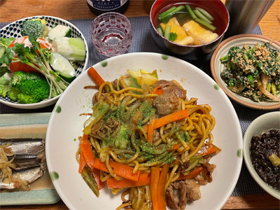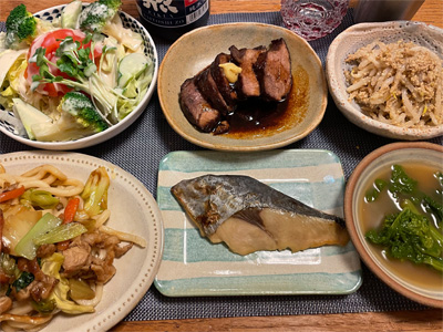 週末はカメラ購入資金のため倹約で宅呑み続きです。焼うどん、野菜サラダ、焼き豚、モヤシの胡麻和え、菜の花のからし和え、鰆の西京焼き。で、日本酒とハイボール。