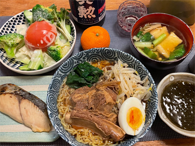 鰆の西京焼き、野菜サラダ、小松菜とお揚げのお汁、ほうれん草の胡麻和え、自家製ラーメン。デザートにポンカンと、チョコクリームパン。