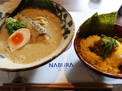 翌日は北野白梅町のラーメン「なぶら」に初めてお邪魔して、鯖ラーメンと鯖まぜご飯。鯖の出汁がガッツリきいた濃厚スープで旨かった!!