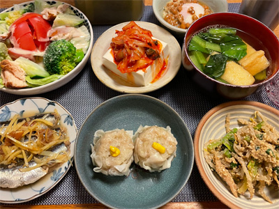 いわしの梅煮、野菜サラダ、キムチ冷奴、納豆の巣ごもり玉子、小松菜とお揚げのお汁、モヤシとほうれん草の胡麻和え、シウマイ。デザートにプリン。
