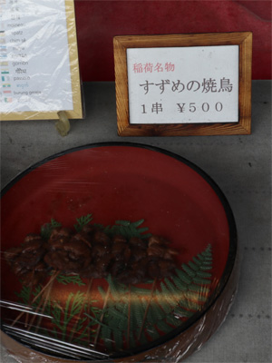伏見稲荷の名物(迷物)、すずめの焼き鳥。自分は食べたいとも思いませんが……。