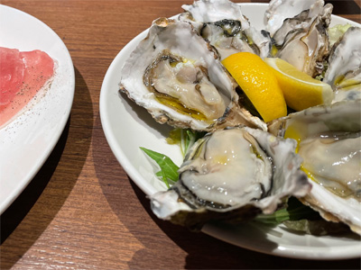 「貝と白ワインのバル KAKIMARU 七条店」にて、生牡蠣、焼き牡蠣その他。