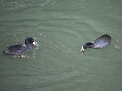 望遠レンズといえば鳥を大きく撮りたくなるのが人の常でしょうか。水草をめぐってケンカする二羽(オオバンという鳥のようです)。