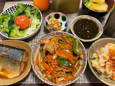 ほっけの塩焼き、野菜サラダ、明太子冷奴、小松菜のかきたま汁、豚肉とピーマンとジャガイモの中華炒め、白菜の昆布漬け。デザートにみかんと、シュトーレン。