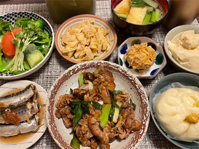 銀鮭の西京焼き、野菜サラダ、キムチ冷奴、小松菜のかきたま汁、鶏手羽元と玉ねぎの煮込み、じゃがバター明太子&ほうれん草。デザートにタカナシのヨーグルト。