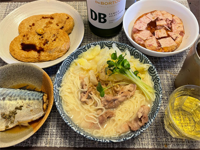 夕食はどこの居酒屋も忘年会シーズンで混んでいるので、スーパーの総菜を買い込んで自宅飲み。サーモン寿司、野菜サラダ、マカロニサラダ、白和え、おから、土手煮込みで白ワインと日本酒。