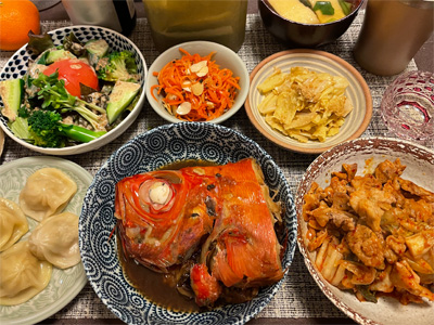 赤かれいの煮付け、野菜サラダ、キムチ冷奴、小松菜のかきたま汁、キャベツのたらこマヨネーズ和え、キャロットラペ、牛肉のすき焼き風。デザートにみかんと、アロエヨーグルト。