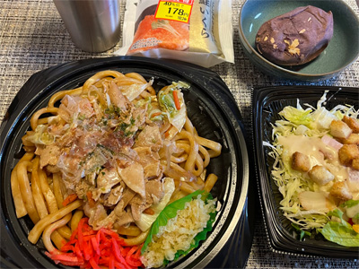 翌日はスーパーの焼うどんとシーザーサラダ、いくらのおにぎり、焼きいもで緑茶がぶ飲み(二日酔いのため)。
