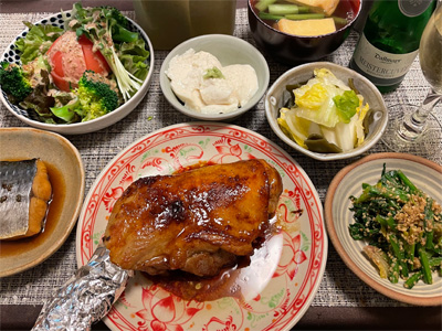 鰆の山椒煮、野菜サラダ、山芋豆腐、小松菜とお揚げのお汁、白菜の昆布漬け、ほうれん草の胡麻和え、ローストチキン。で、スパークリングワイン(頂きもの)。