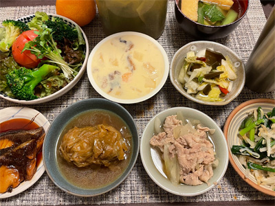 ブリの煮付け、野菜サラダ、茶碗蒸し、白菜の昆布漬け、小松菜とお揚げのお汁、もやしとほうれん草の梅じゃこ和え、豚肉と玉ねぎの煮もの、ロールキャベツ。デザートにみかんと、生チョコクレープ。